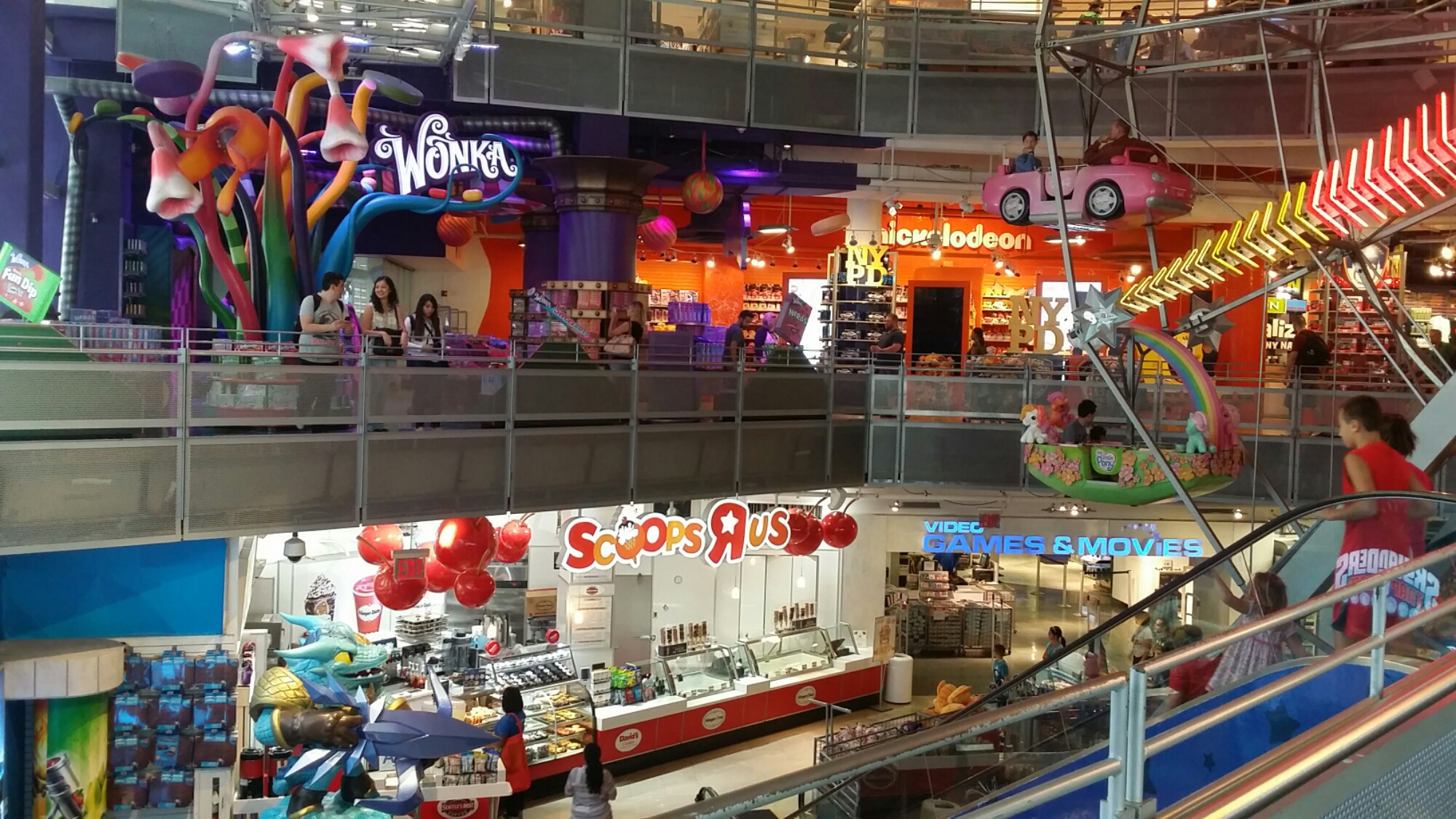 They had a ferris wheel inside and an ice cream shop, a jurassic theme part with a dinosaur that moved, a barbie section and a candy store!