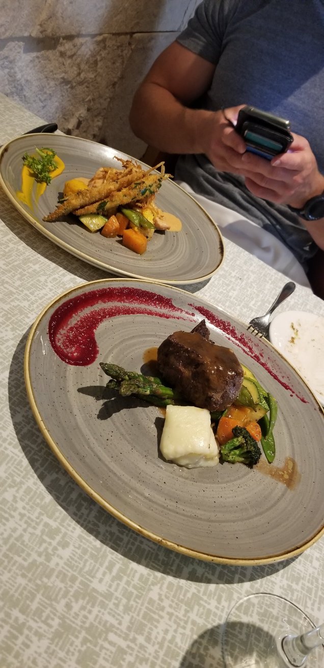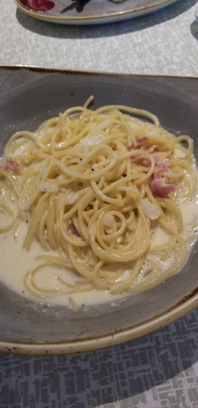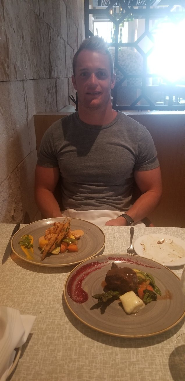 We booked a massage tonight for 8pm so we had a couple of hours to spare until our appointment. I convinced Nathan to have Italian with me tonight and it did not disappoint. Pretty sure it was Nathan’s favourite meal this whole trip. We had some bread to start and a caprese salad, then came our mains. Nathan ordered two mains, a Salmon dish AND beef tenderloin. I ordered a carbonara type dish, along with a Lorenzo’s pizza which was basically chocolate and onion on a pizza. Sounds weird but was actually amazing.