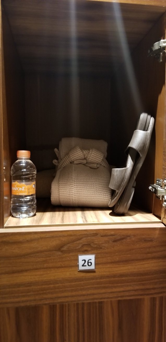 After meeting with the concierge, we were shown to the bathrooms where we were given a key with our own lockers. The lockers were set up really cute with a bathrobe, slippers, water and a towel in them. If anyone knows me, I have clown feet so these little slippers didn’t do much for me. My hooves were falling over the sides as I walked to the pools 🙄